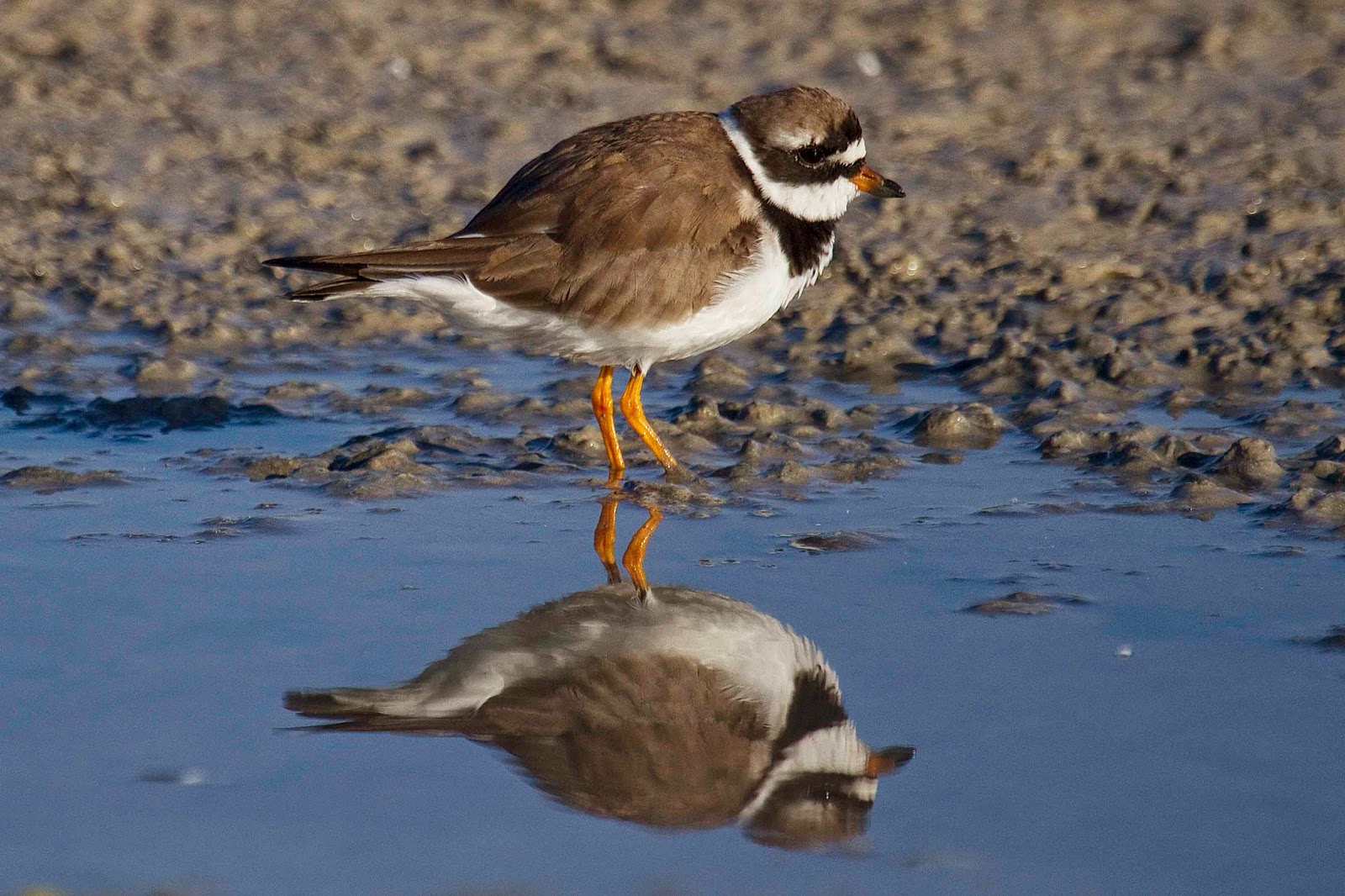 Es el más grande de los pequeños chorlitejos, con casi 20 cm, presentando un plumaje pardo en el dorso y blanco níveo en la zona ventral, con un amplio collar negro en el pecho, y una banda también negra en la frente. Las patas son un vivo color naranja, siendo el pico amarillento, pintado de negro en la punta. Cuando vuela se distingue una franja alar blanca, que lo diferencia del chorlitejo chico. Ambos sexos son iguales.